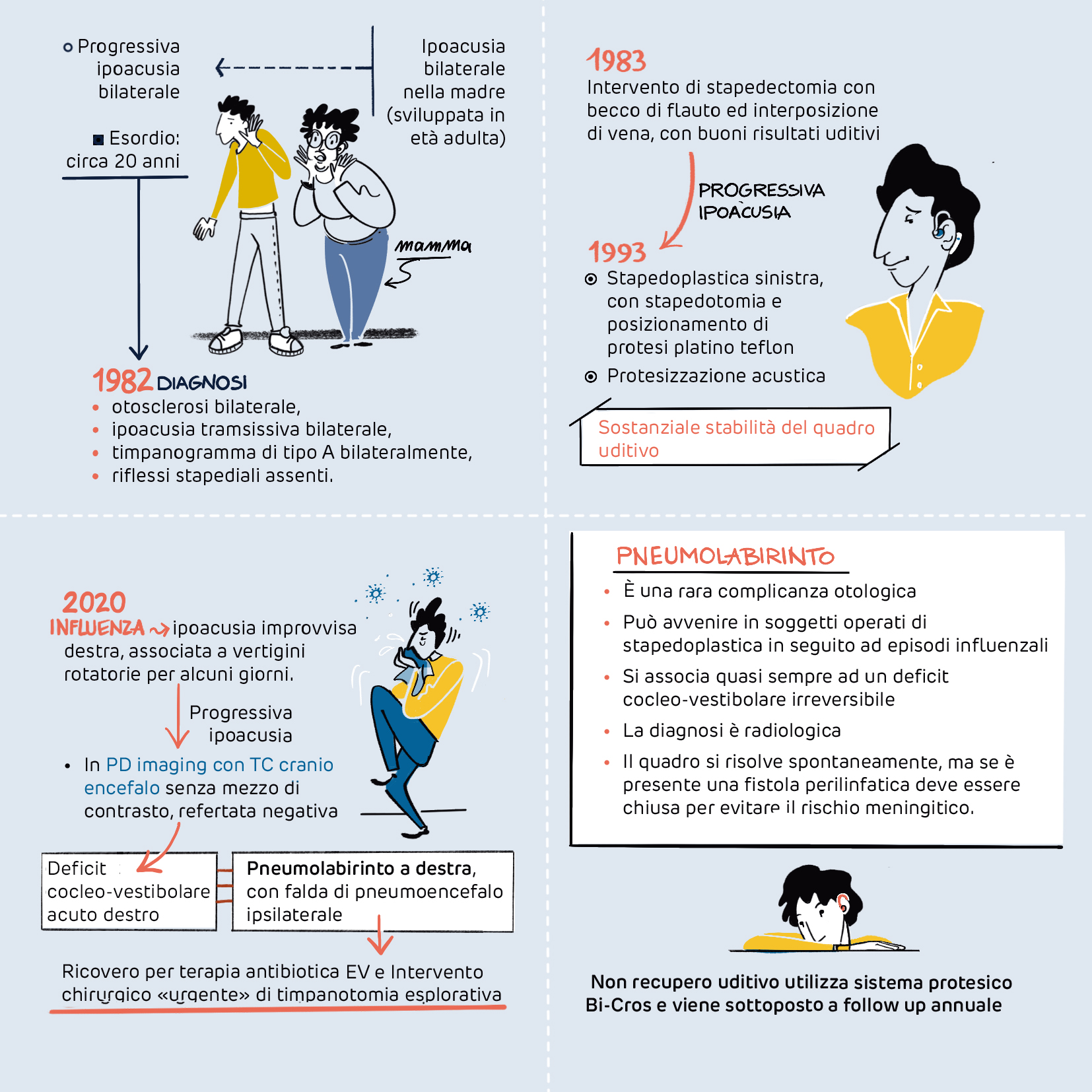 Nel 2020, dopo episodio influenzale, compare ipoacusia improvvisa destra con vertigini. La TC evidenzia pneumolabirinto destro associato a pneumoencefalo, complicanza rara nei pazienti operati di stapedoplastica. Sottoposta a timpanotomia urgente, viene riscontrata una fistola labirintica a livello della platina, chiusa chirurgicamente con riposizionamento di protesi. Non si osserva recupero uditivo; la paziente utilizza sistema Bi-CROS ed è in follow-up.